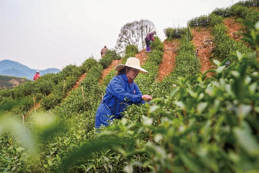 沿着山路转过几道弯,向远处眺望,昔日的荒坡已化作漫山遍野的绿意,一垄垄茶树依山顺势,织就连绵起伏的画卷。晨光初破晓,整片茶园还笼罩在薄纱般的雾气里,但已经有不少像欧阳月英一样的村民早早来到茶园,背着背包在茶垄间忙碌着。