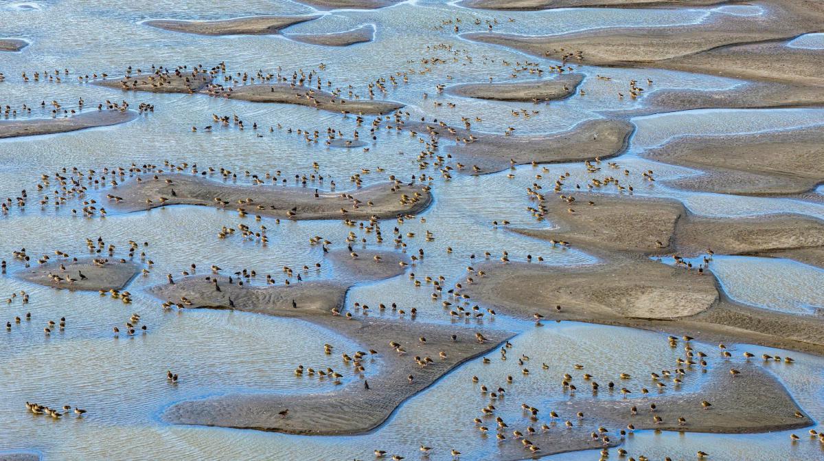 11月20日,在长江湖北黄石段,候鸟在江面上觅食。(周巍 摄)