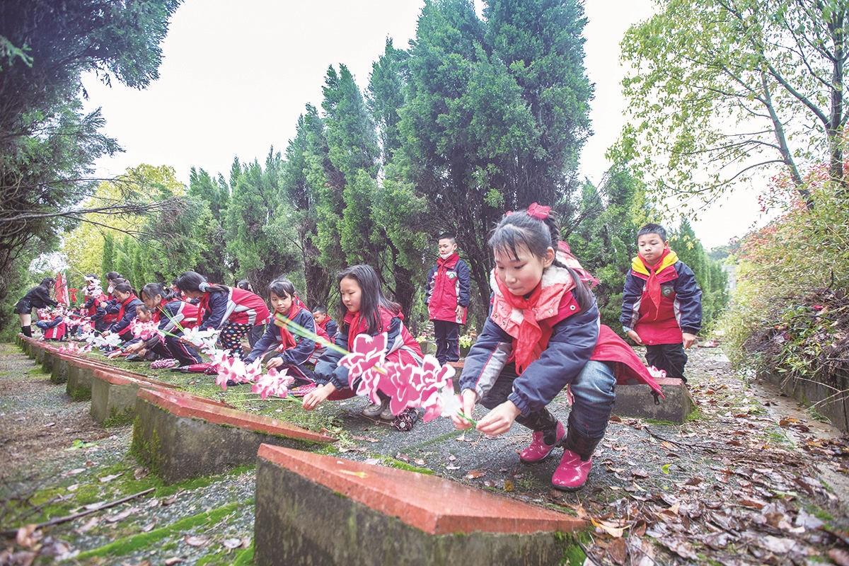 昨日,阳新县龙港镇八一小学学生在湘鄂赣边区红军烈士墓林敬献鲜花,表达对革命烈士的崇敬和缅怀。