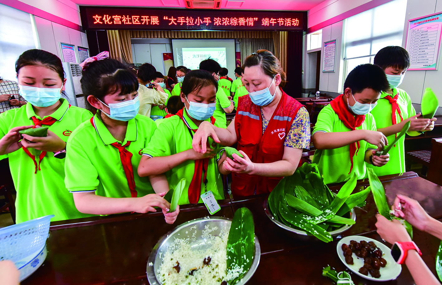 昨日,广场路小学组织学生来到黄石港区文化宫社区,与社区居民一起包粽子,体验端午节的民俗文化。 记者 鄢巍 通讯员 吴洁娜 摄