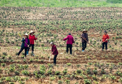 虽然三月采茶季已过,程贤平的茶园里依旧一派繁忙的景象。骄阳下,村民们带着草帽,拿着铁锹穿梭于茶林间,熟练地给白茶树苗除草和整土。