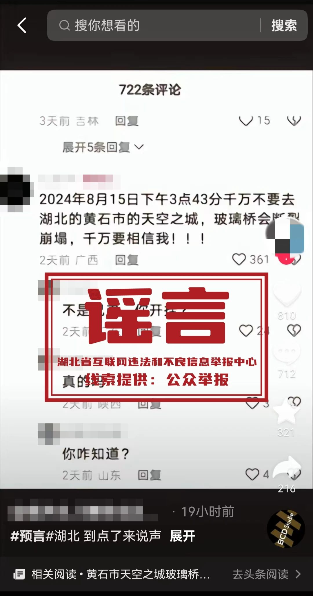 “2024年8月15日下午3点43分千万不要去湖北黄石市的天空之城,玻璃桥会断裂崩塌,千万要相信我!!!”记者在网上查到,这则跟帖是一名网名为“九点半”的网友所发,IP地址显示是在广西。