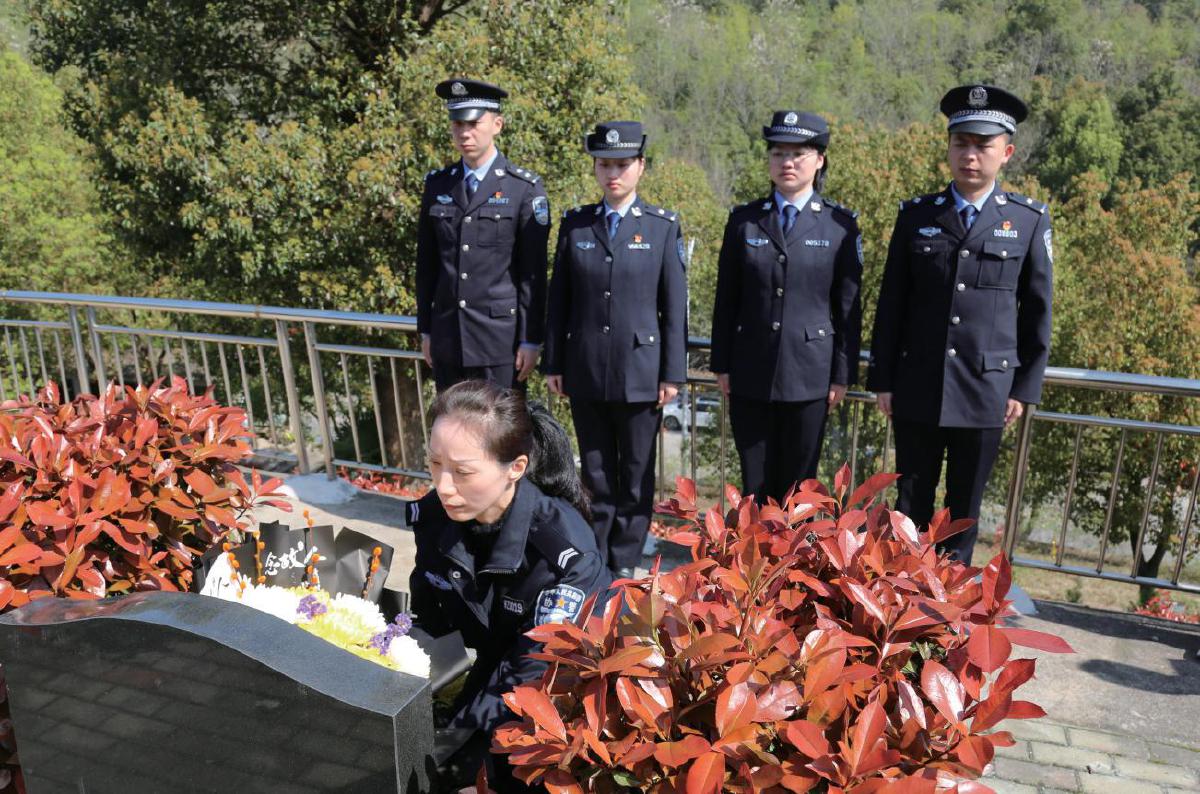 胡秋婵与黄石港公安分局青年民警一同来到其丈夫、因公牺牲民警王文利墓前祭扫
