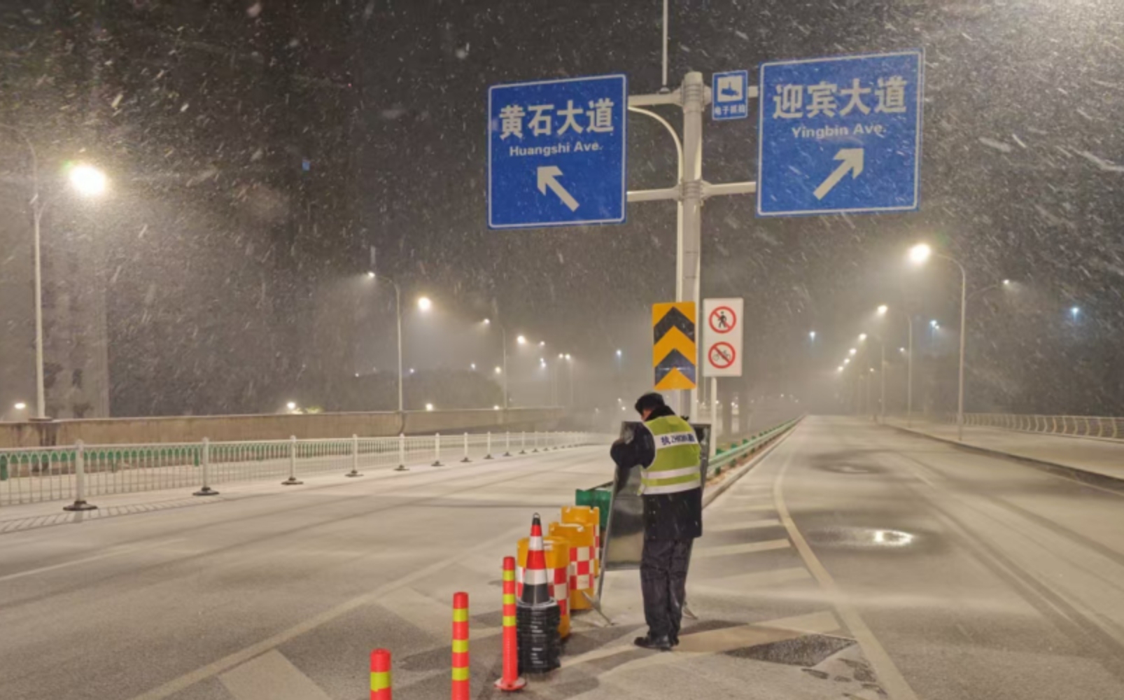凌晨3时40分至4时10分,黄石港大队民警先后对沿江大道、湖滨大道、黄石大道、迎宾大道、大泉路等多条道路的易结冰路段进行巡查,及时设置雨雪天气慢行提示牌,守护道路安全。