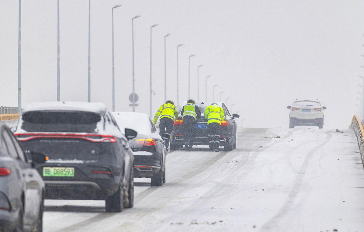 记者跟随廖长青看到,黄石长江公路大桥经营有限公司组织的工作人员刚刚将工业盐运抵现场,正准备开始撒盐融雪。在大桥中央,黄石市交通运输综合执法支队执法六大队的执法人员则拿着草垫子,帮助因打滑无法启动的车辆脱困。廖长青和同事见状,立即上前指挥交通的同时,帮助推移被困车辆。