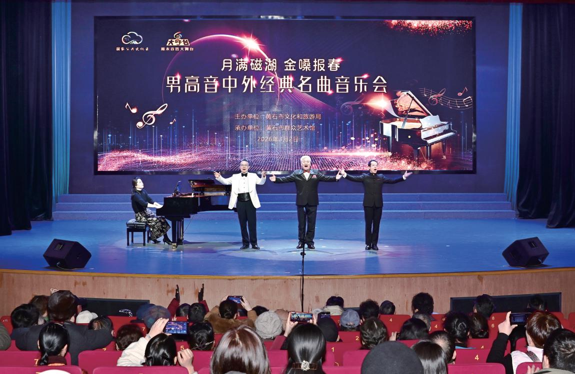 3日,“月满磁湖 金嗓报春”男高音中外经典名曲音乐会在市群艺馆举行,特邀著名男高音歌唱家乐汉宁、钟家明、刘盛昌联袂主唱。(黄石融媒记者 石勇摄)
