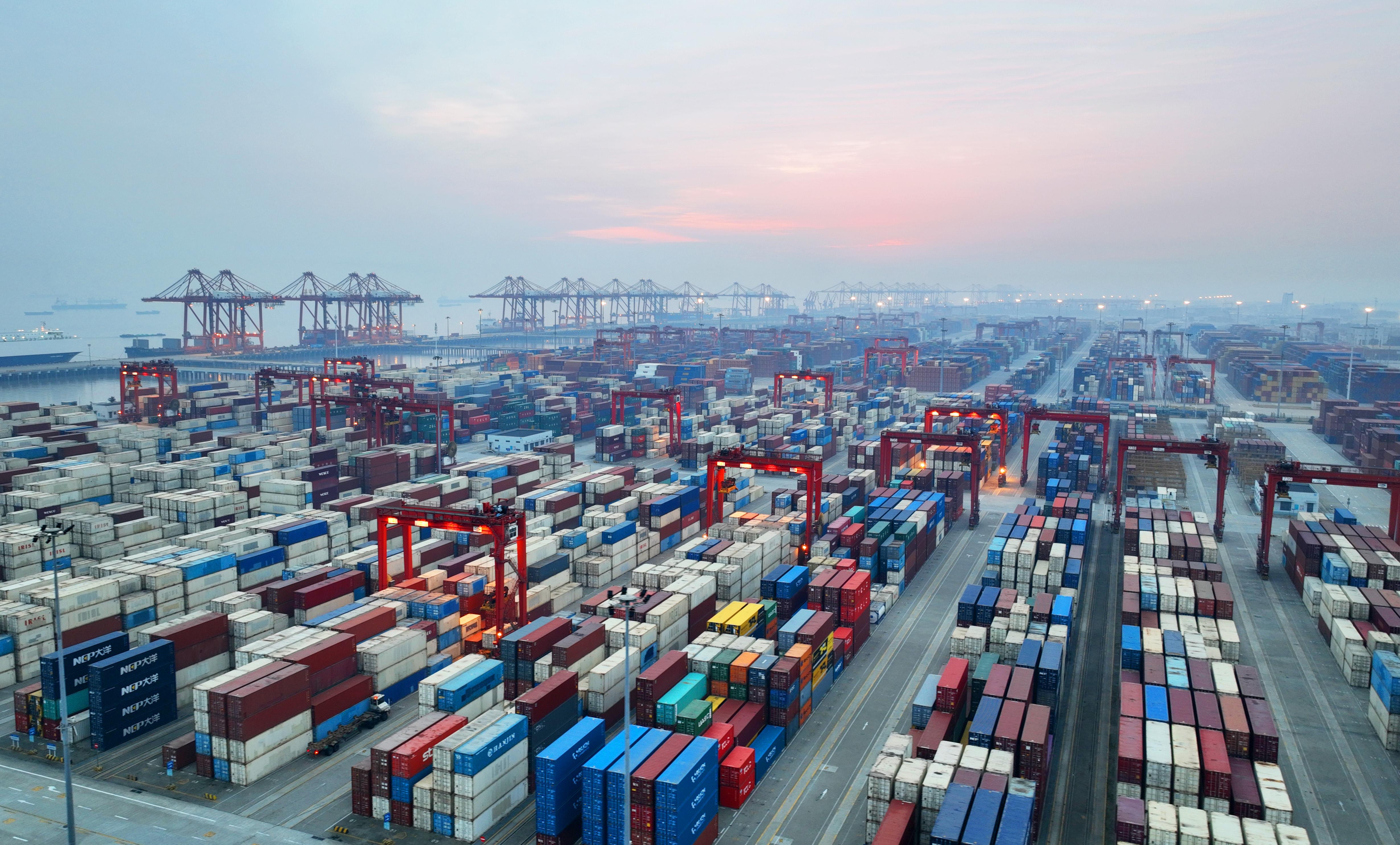 △2023年1月1日,江苏省太仓港集装箱码头吞吐作业繁忙有序。
