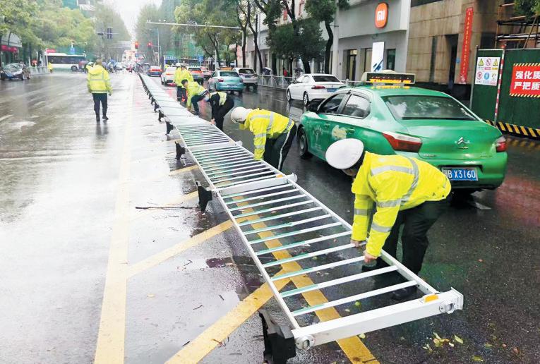 黄石港大队民辅警合力扶起被吹倒的护栏