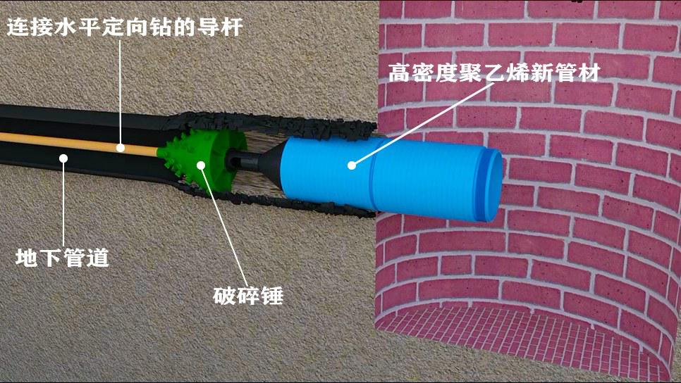 汪达解释,该技术犹如“微创手术”:钻机前端的水平定向钻头从一端井口钻入,对旧管道进行破碎和扩径;同时,连接着新管材(定制高密度聚乙烯管,每节约50厘米长)的破碎装置从另一端同步推进。在液压装置提供的回拖力与挤推力共同作用下,旧管道被破碎的同时,新管道被原位置换进去,修复后即可恢复排水功能。