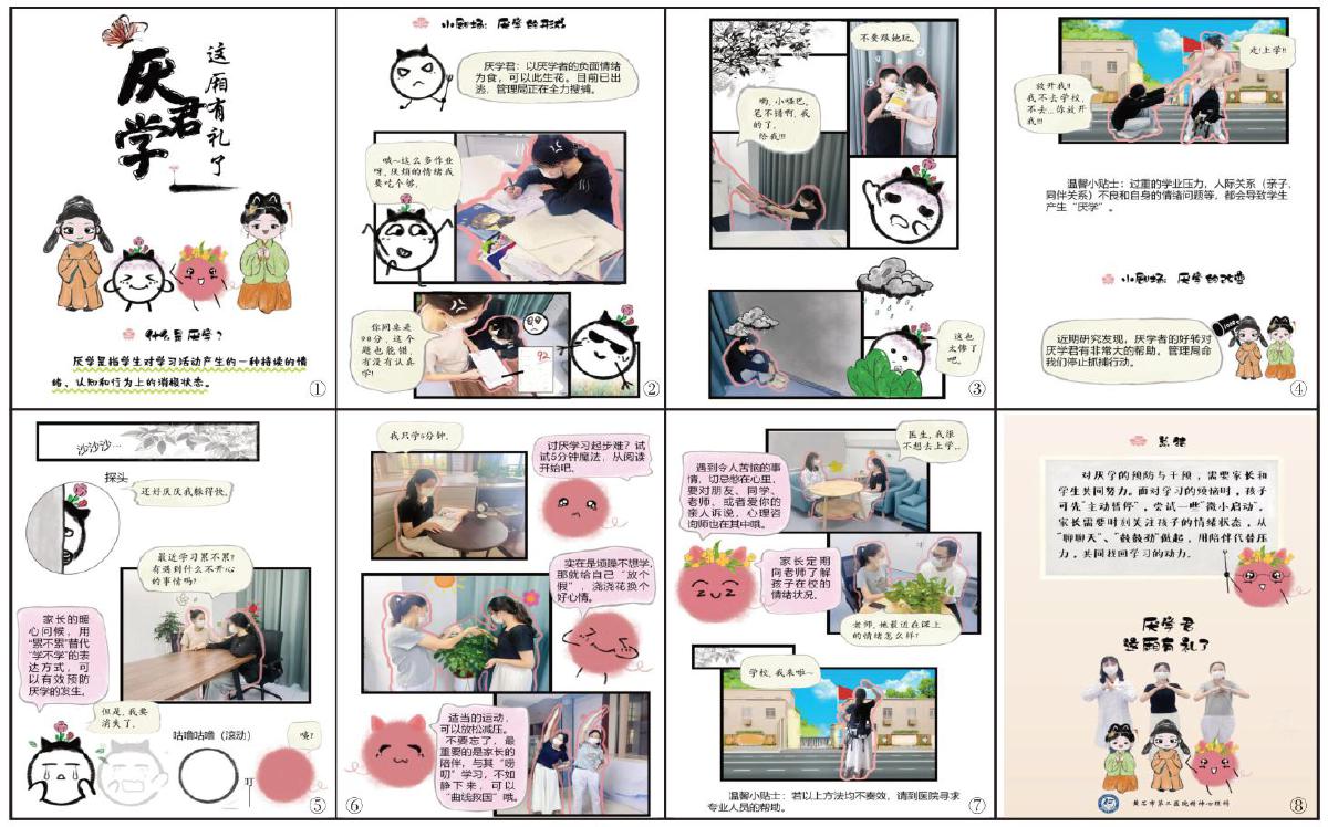 值得一提的是,图文类一等奖作品——由黄石市第二医院创作的《厌学君,这厢有礼了》(见下图),以活泼的画风、轻松有趣的表达,对“厌学”这一常见心理现象进行了深入浅出的科普。作品通过拟人化的角色和情景设计,将专业知识转化为通俗易懂的视觉语言,不仅贴近大众认知,也有效提升了健康科普的传播力和感染力,最终在众多参赛图文作品中斩获一等奖。