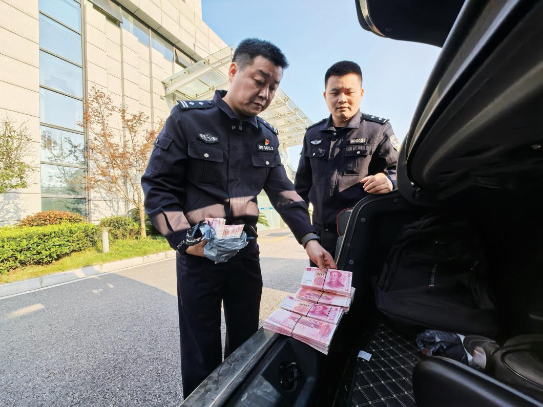 徐海雄(左)和同事在清点车辆后备厢中搜出的现金 记者 李飞 摄