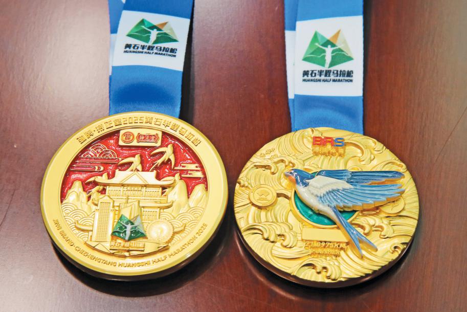 奖牌正面以黄石市花石榴花为基底,寓意热情与活力。繁花之上,通过浮雕工艺呈现黄石的地标建筑、层峦叠嶂与灵动水波,在方寸之间勾勒出一幅“山水相依、城景共融”的立体画卷。奖牌背面环绕滔滔江水,寓意黄石“临江而建、因水而生”的城市特色。视觉中心镶嵌绿色圆环,特别采用黄石特有的孔雀石进行点缀。圆环上方融入小燕子元素,且可拆卸作为冰箱贴。