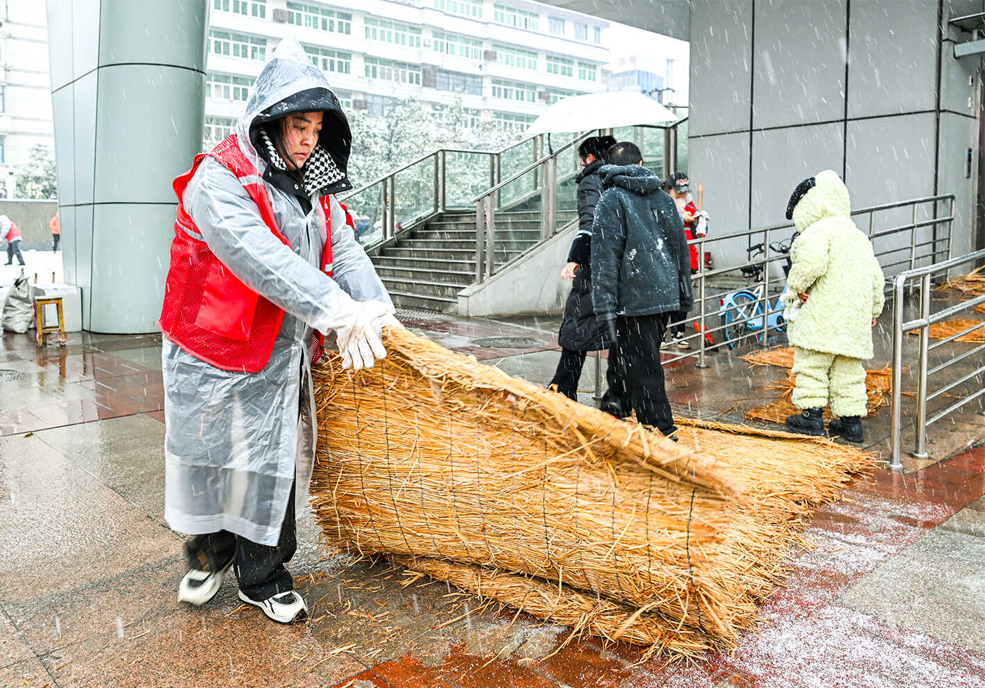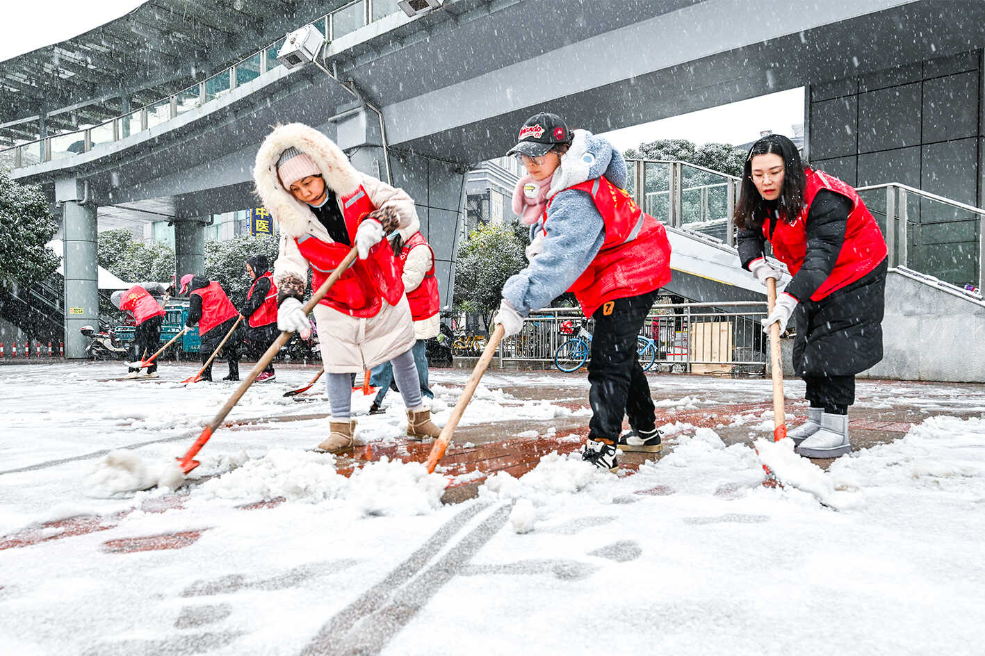 19日,黄石港区文化宫社区工作人员与志愿者们冒着风雪开展铲雪除冰行动。大家手持工具清理路面积雪,并铺设草垫防滑,用实际行动筑牢居民出行安全防线,让寒冷冬日充满温暖。(黄石融媒记者 鄢巍 通讯员 李旎 摄)