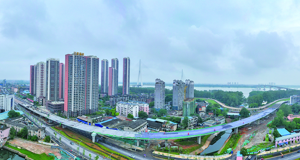 12日,正在建设中的上港高架桥。该高架桥两端连接黄石大道北延和长江干堤,是黄石连通鄂州花湖机场的关键工程,目前已进入辅助工程施工阶段,预计9月全部完工。
