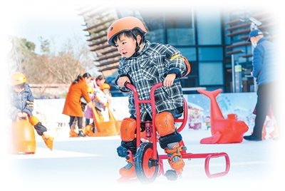 1月7日,游客在浙江省湖州市德清县下渚湖·奇幻谷景区户外冰场体验冰上自行车。 |