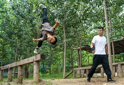 刘龙(右)指导儿子刘亦行进行障碍训练(8月16日摄)。