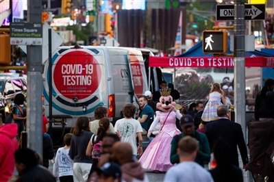 5月12日,在美国纽约时报广场,人们从一个新冠检测点旁经过。新华社发