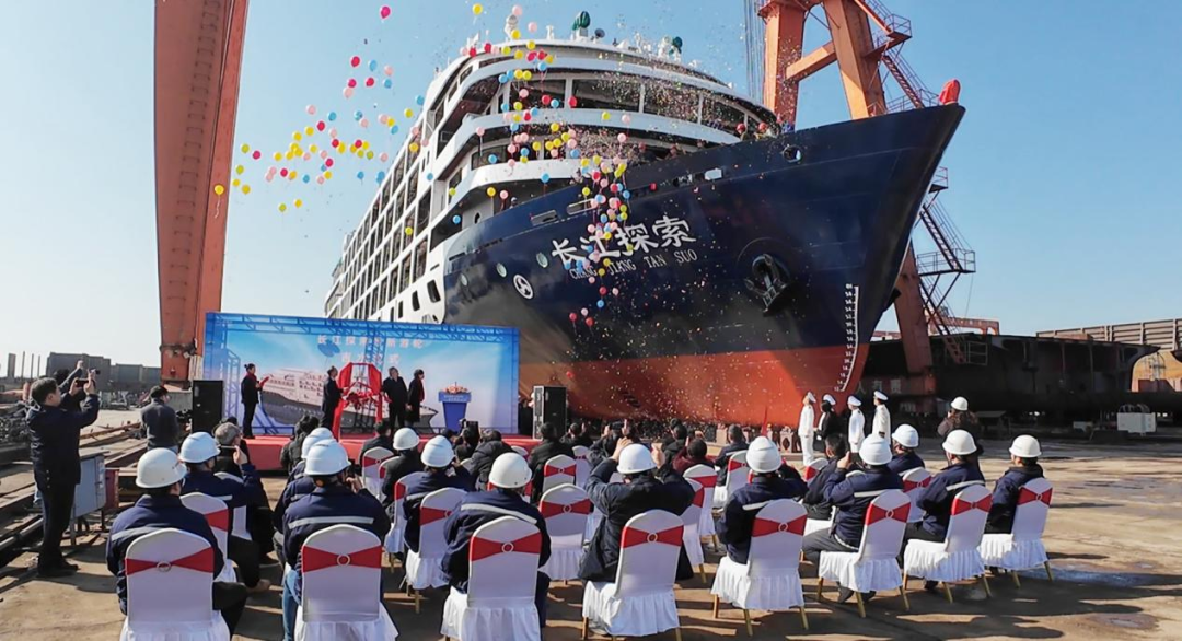 ▲1月5日,长江探索号豪华游轮吉水仪式在宜昌城发集团鑫汇船舶公司厂内举行。长江探索号主要运营“宜昌-重庆”三峡航线。图片来源:宜昌城发集团