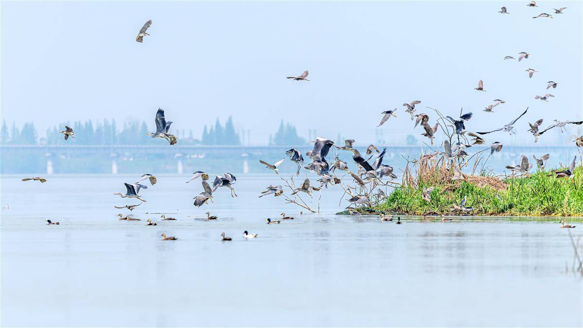在位于荆州市长湖湖心岛马洪台上,成百上千只鸟在嬉戏觅食。(视界网 黄思明 张文元 摄)